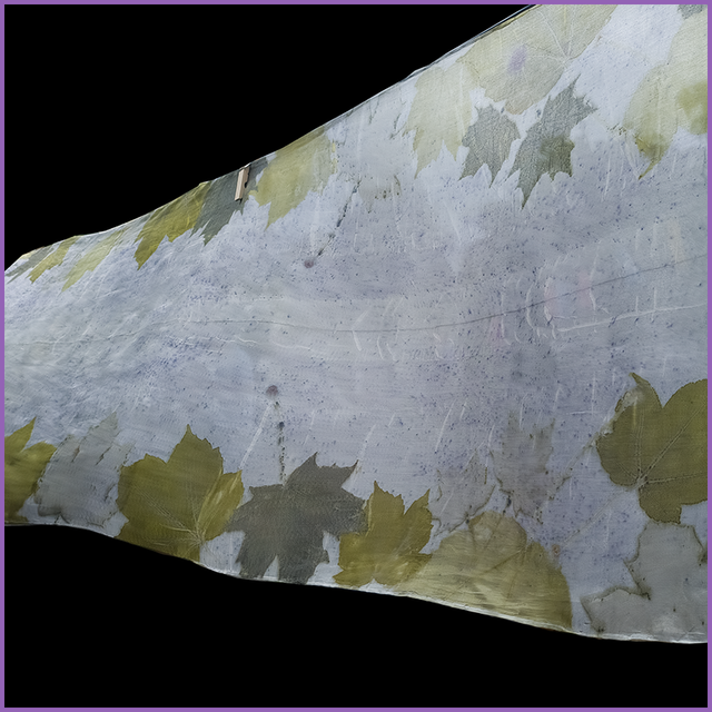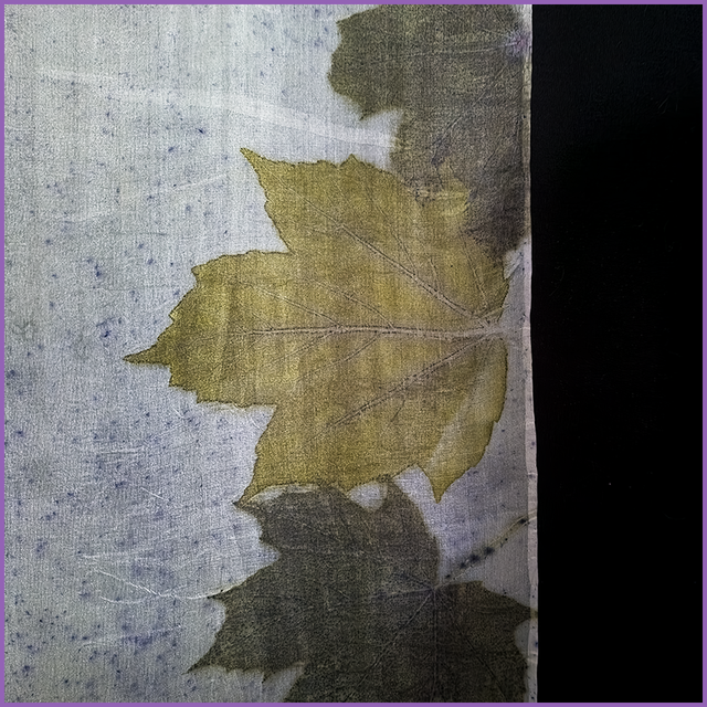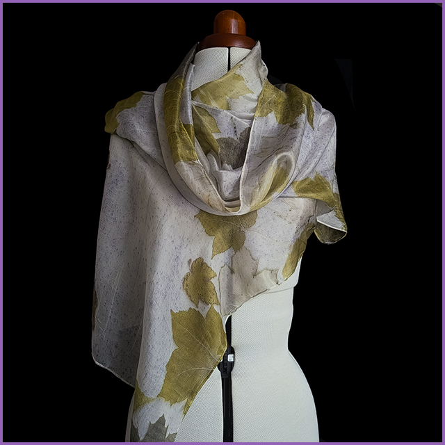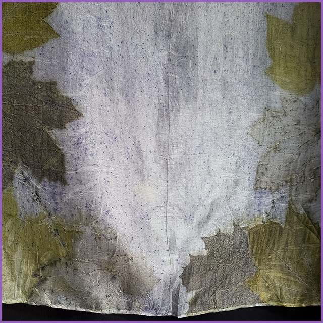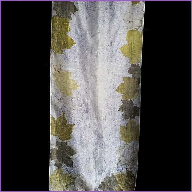 100% Silk Scarf - 180cm x 45cm - eco printed with sycamore and maple leaves, blanket dyed with logwood