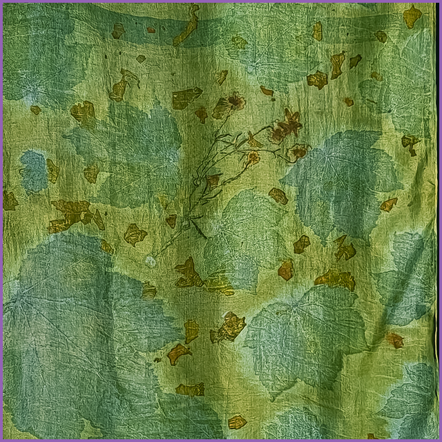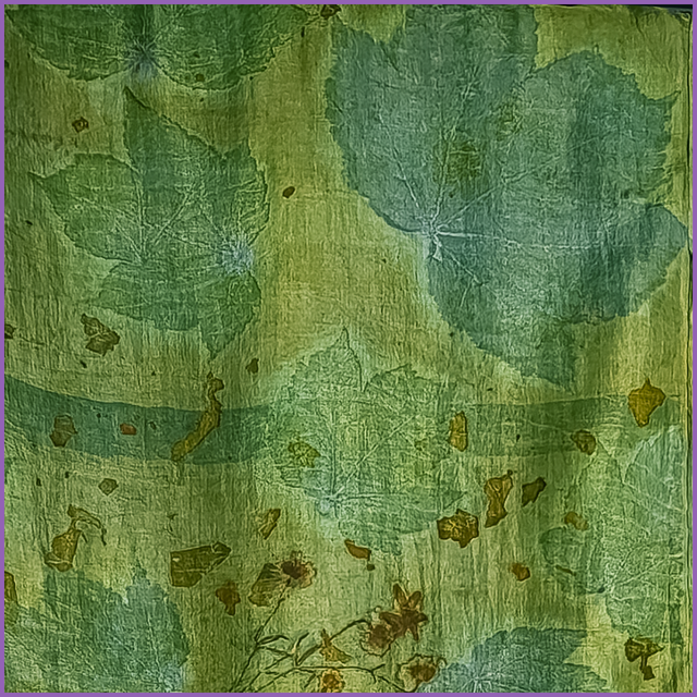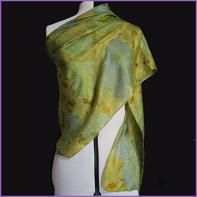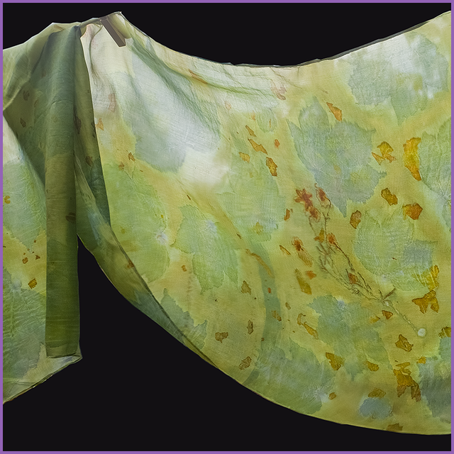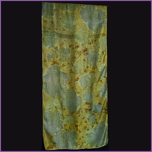 100% Silk Scarf - dyed with weld and indigo and eco-printed with sycamore, onion skins and coreopsis
