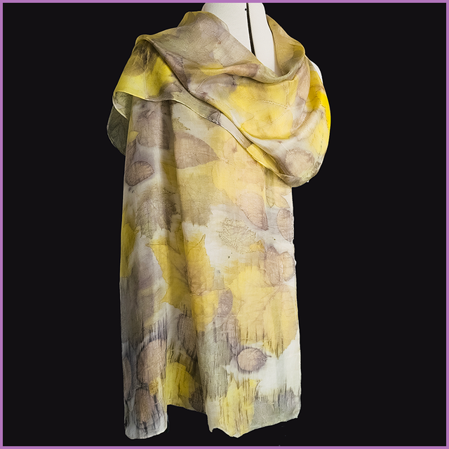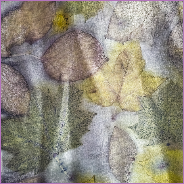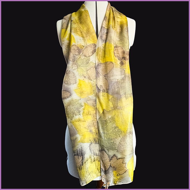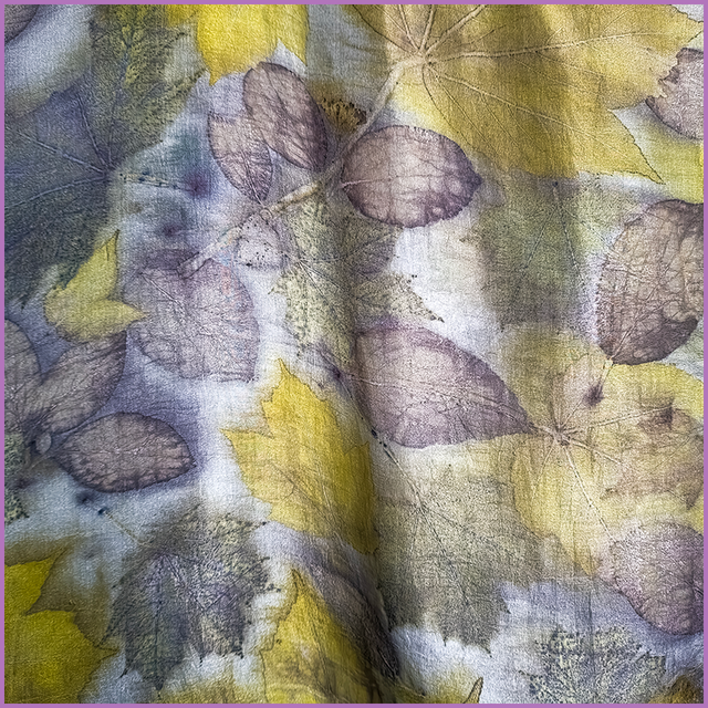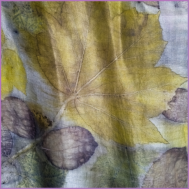 100% silk scarf - eco printed with maple, sycamore and lime leaves, wrapped in an iron blanket