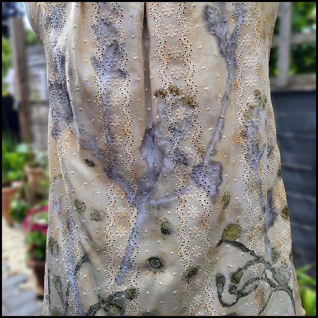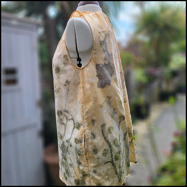 This up-cycled, size 14 cotton embroidery anglaise sleeveless top, originally by Fat Face, has been eco-printed with dandelion and field buttercup flowers wrapped in an iron blanket. The iron has added a peachy hue and the rich layered prints produce an elegant woodland effect.