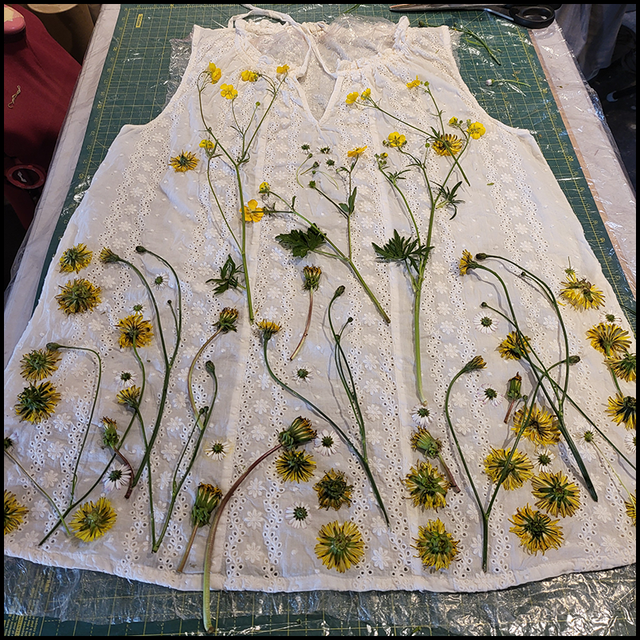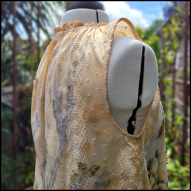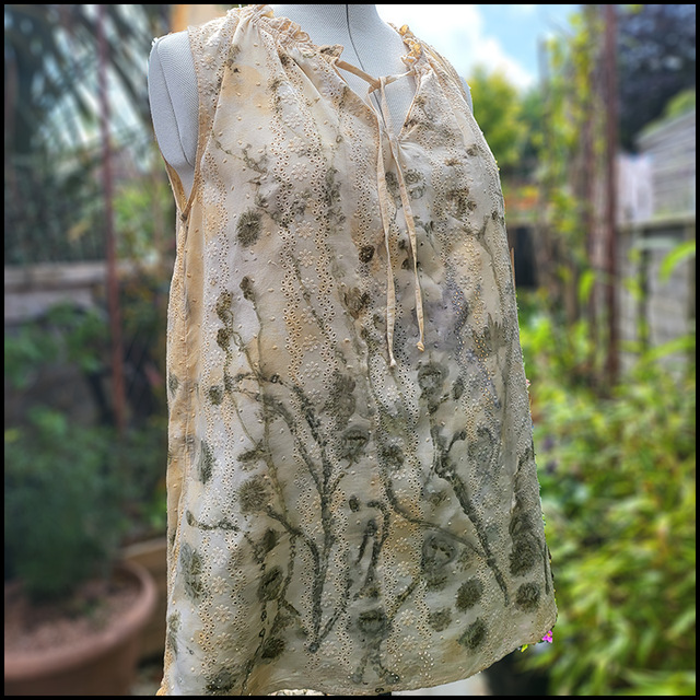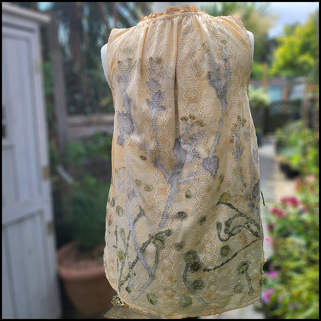 Cotton embroidery anglaise sleeveless top - eco printed with dandelion and buttercup flowers wrapped in an iron blanket size 14