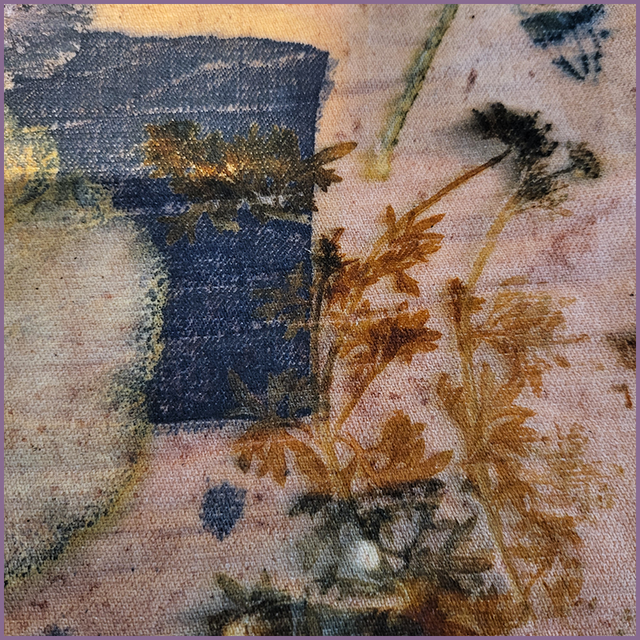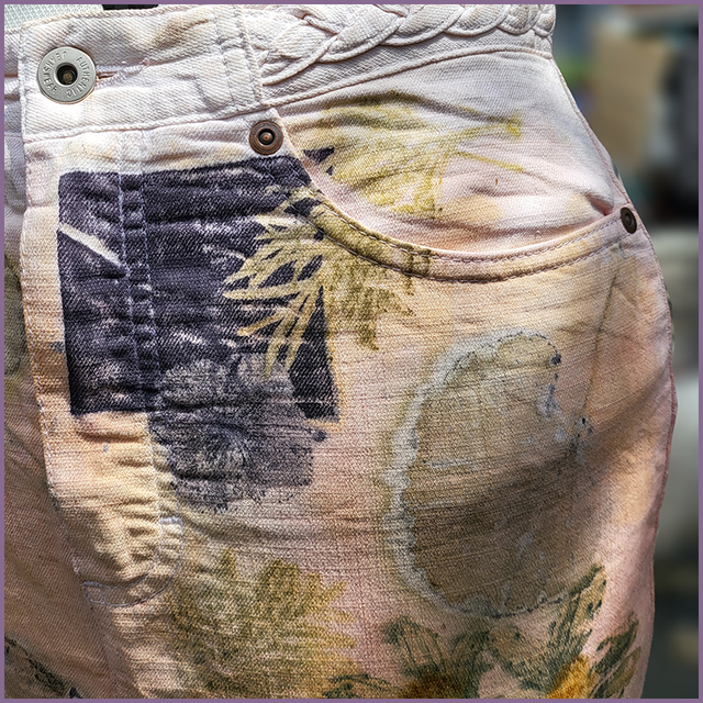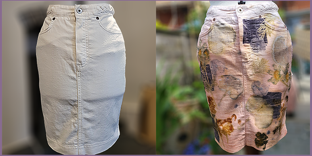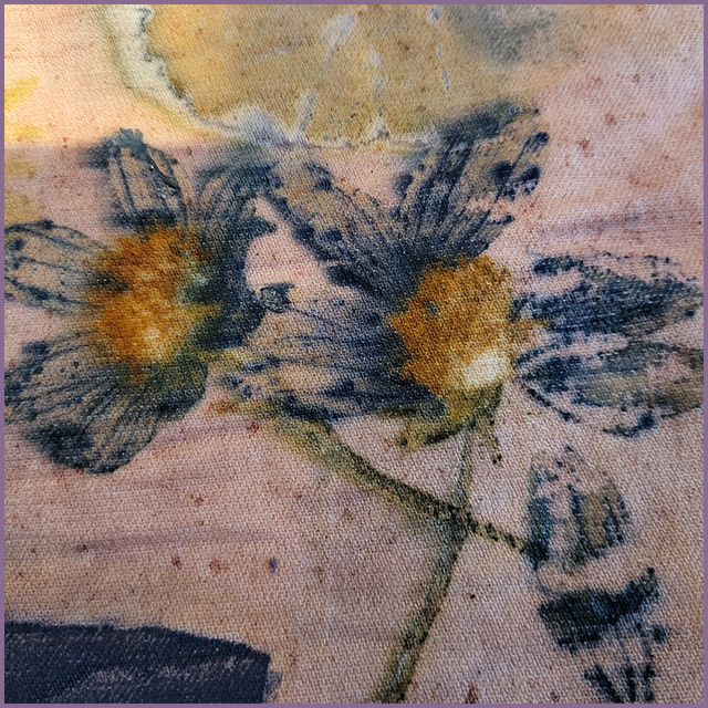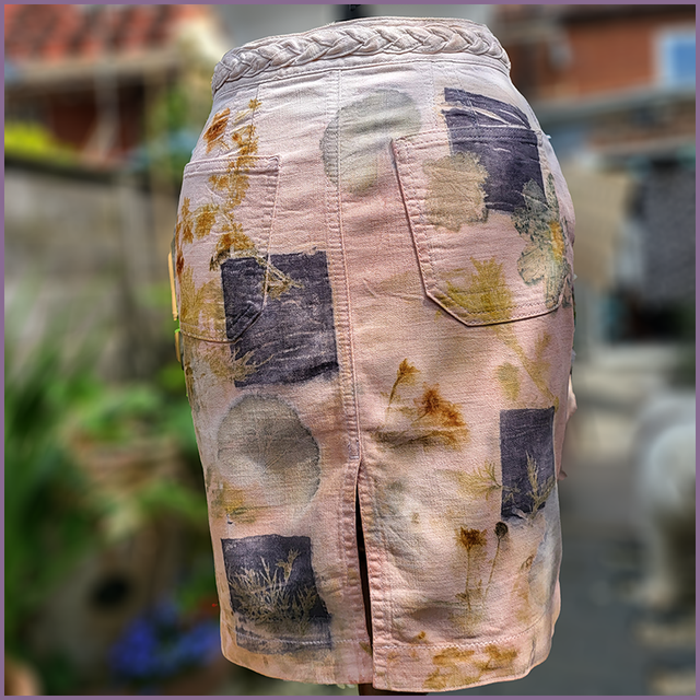 We wanted to create a patchwork finish, and after dip dying the skirt in a madder root dye, laid coreopsis, bidens and geranium leaves and flowers on the garment followed by a few squares that had been soaked in an oak gall solution.