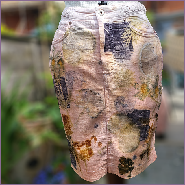 Denim Skirt Size 8 - Patch and Eco Printed with Cosmos, Bidens, Geranium, Madder Root and Oak Gall