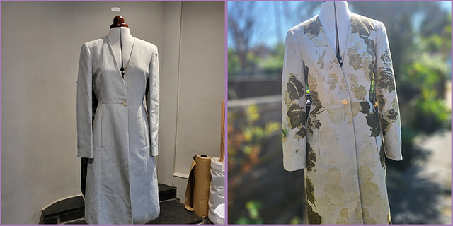 Introducing our stunning Duck Egg Blue Linen Coat, (originally by Warehouse) eco-printed with sycamore and nasturtium leaves for a unique touch. Crafted with care, this size 10 coat features long sleeves for added warmth and style. Perfect for the fashion-forward individual looking to make a statement with sustainable fashion. The earthy tones and organic elements make this coat a versatile piece that can be dressed up or down for any occasion. Elevate your wardrobe with this eco-friendly piece that stands out while promoting environmental consciousness.