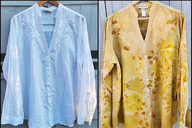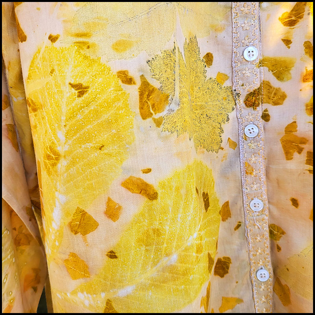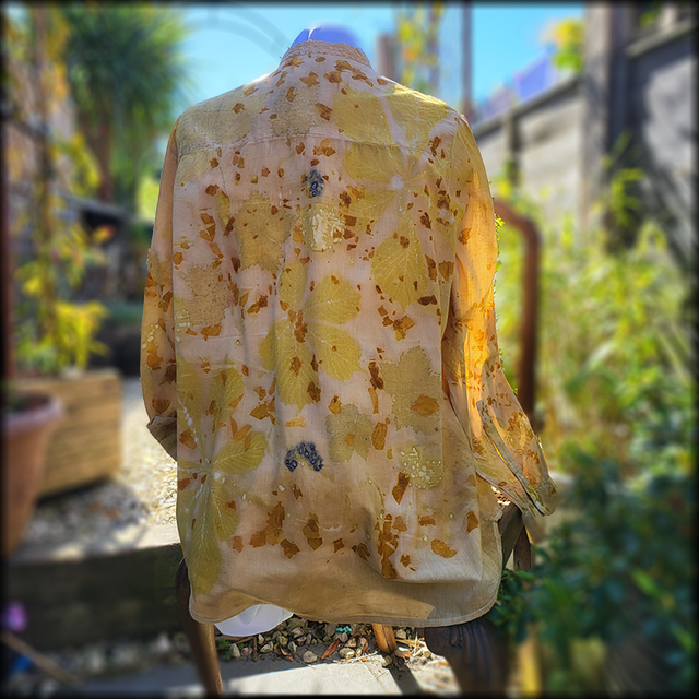 Soft Indian cotton blouse by Vintage Goa - dyed with onion skin, then eco-printed with onion skin, horse chestnut and sycamore leaves. Size XL