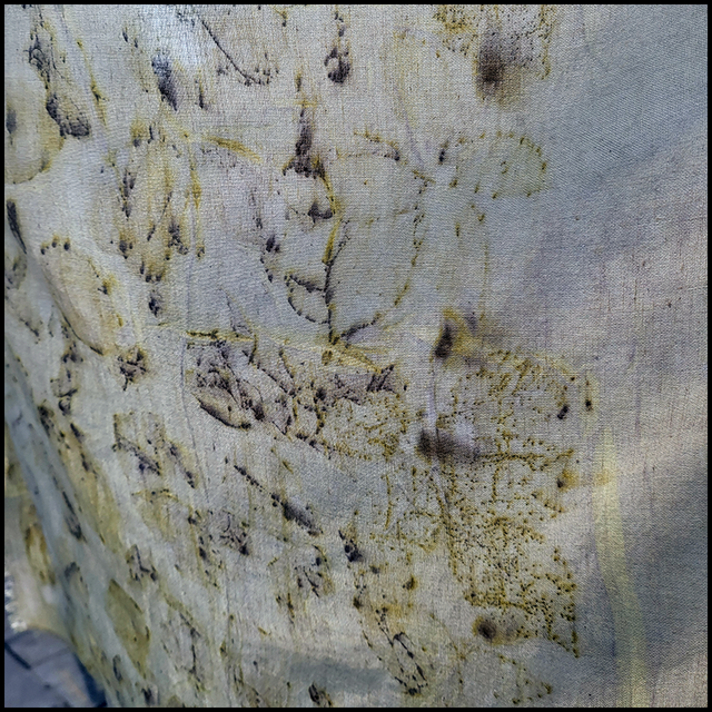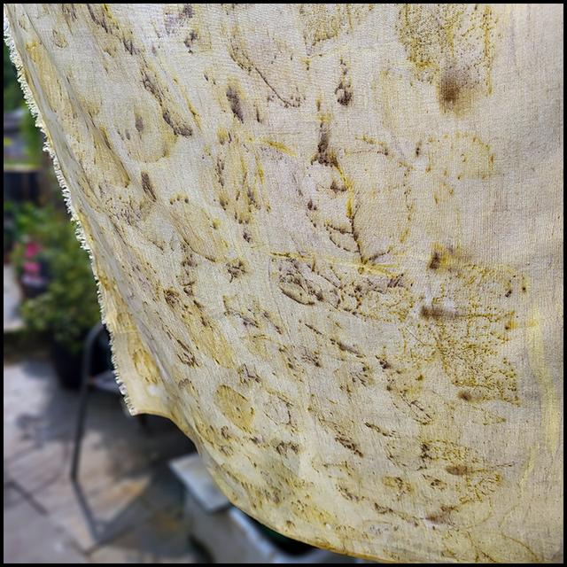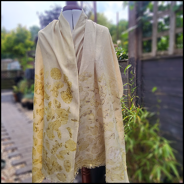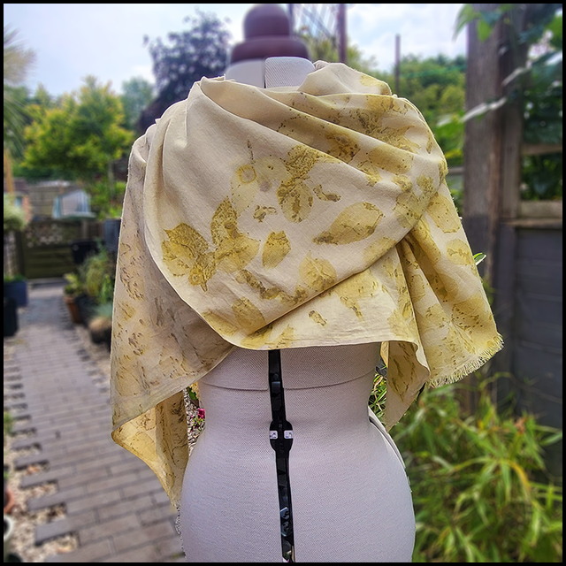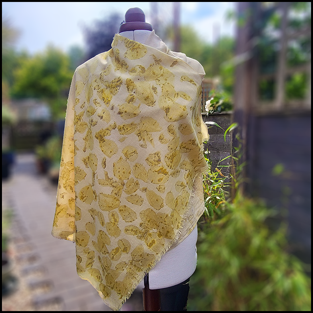 Organic cotton pashmina - eco printed with white rose petals and leaves and over dyed with dried marigolds.