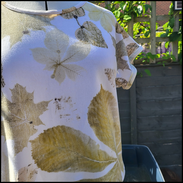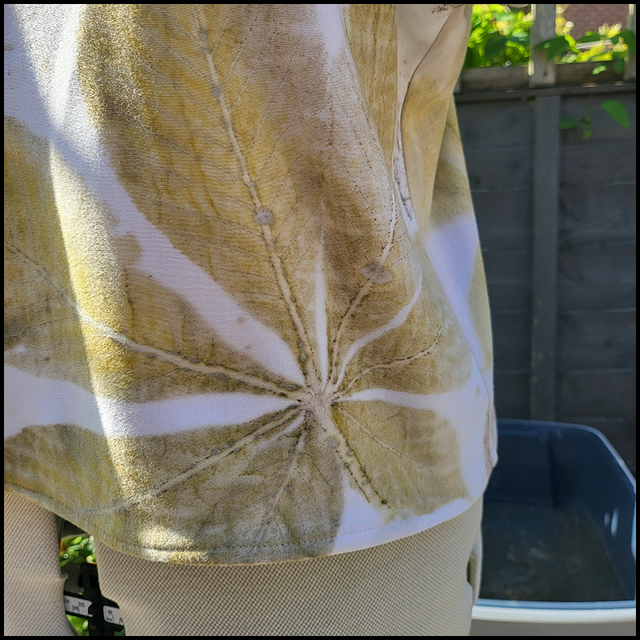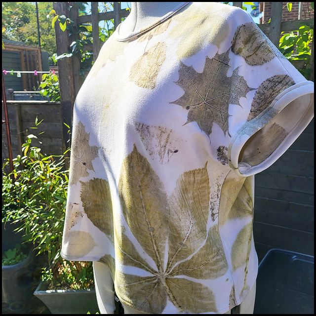 Handmade by Tinctura Amica, this organic cotton cropped box top has been eco-printed with horse chestnut, Ivy, and sycamore leaves wrapped in a blanket soaked in iron water.