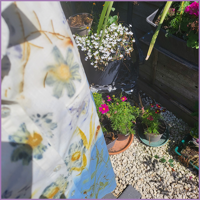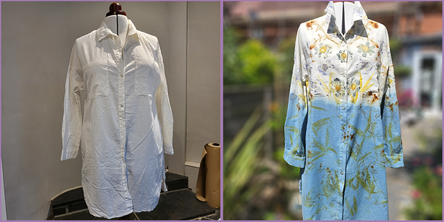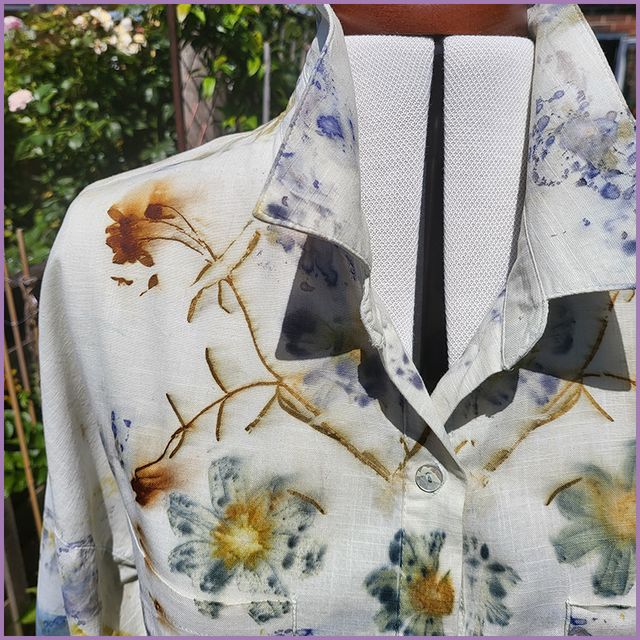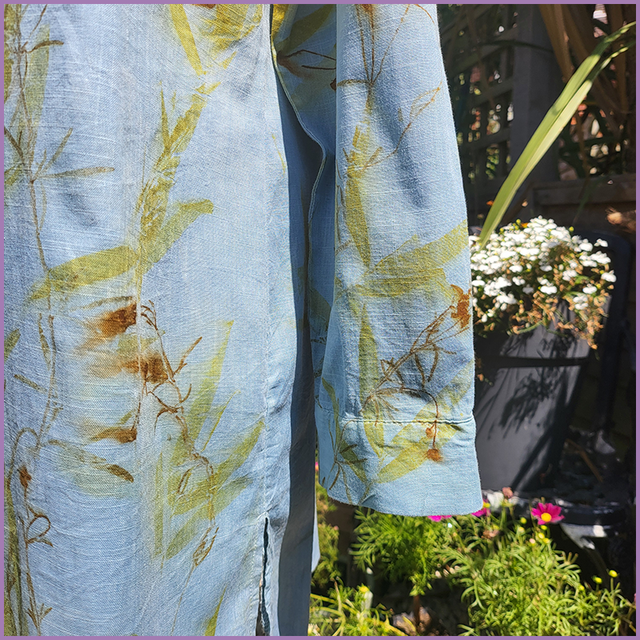 After dip dyeing it in our indigo vat, this garment was eco-printed with bamboo, coreopsis, cosmos, pelargonium and african daisies.