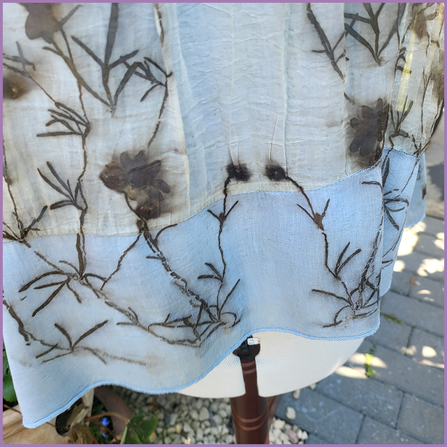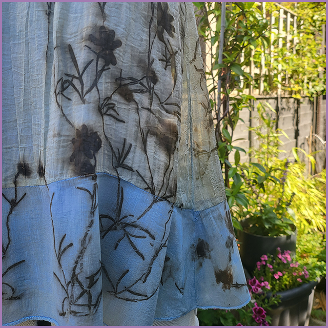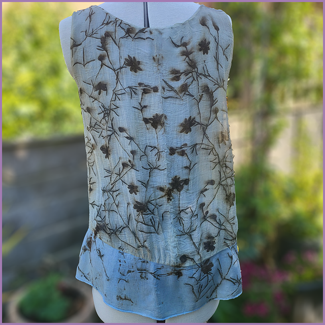 We wanted to expand the colours in our range, and this is the first of 4 items that were dyed in our indgo vat. After it was submersion dyed, we soaked the garment in iron and then eco-printed this with our old favourite, coreopsis. The results were stunning and surprising. The iron muted the indigo colours on the silk, while indigo blue remained vibrant on the linen and cotton jersey.