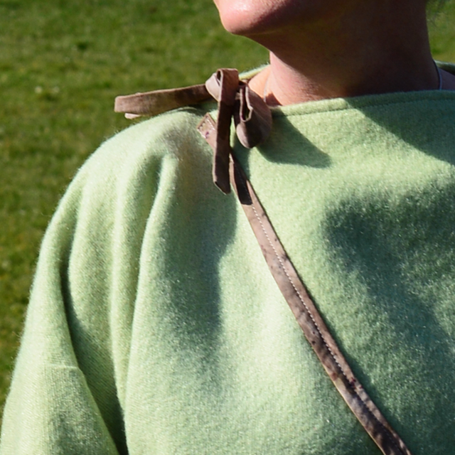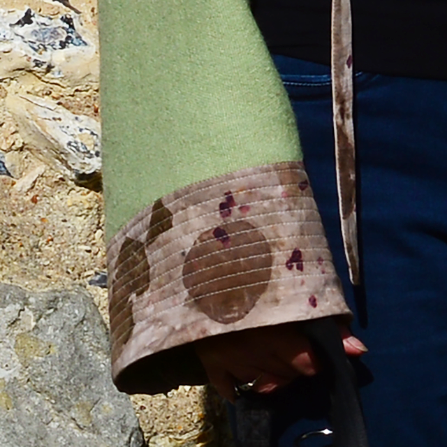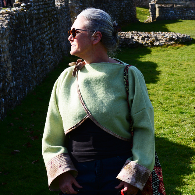 Wool bolero jacket / cardigan - size medium. Apple green wool edged with cotton that has been eco printed with eucalyptus, madder root and onion skins. This is a multi-look piece and can be worn closed to give a boat neck-line using the decorative ties or open allowing the fabric to create a beautiful cascade effect at the front.