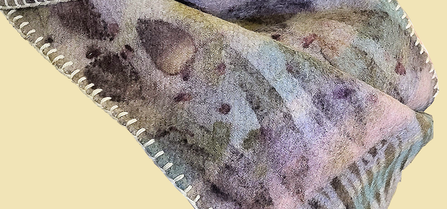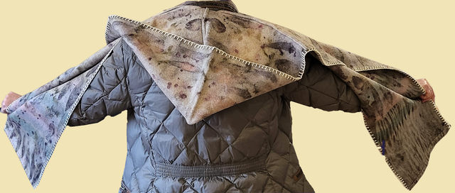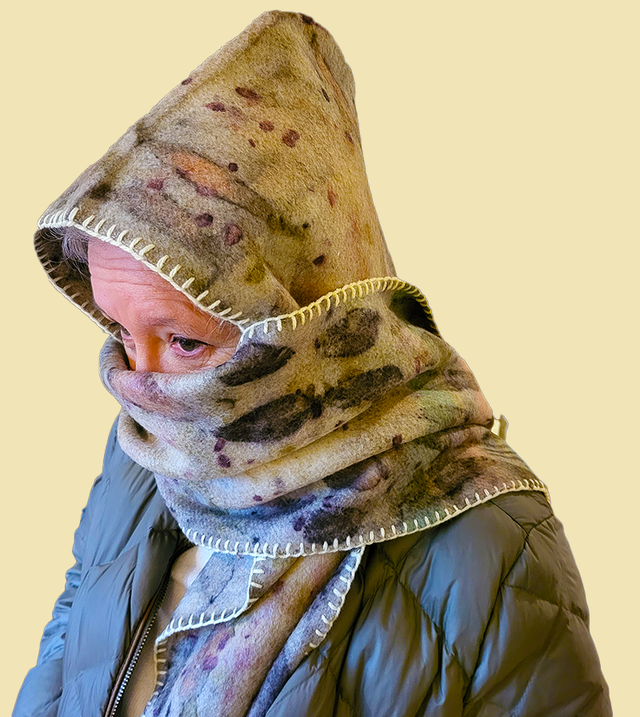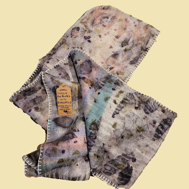 Wool Scoodie - eco-printed with eucalyptus, onion skin and madder. Hand finished with french seams and cream blanket stitch.
